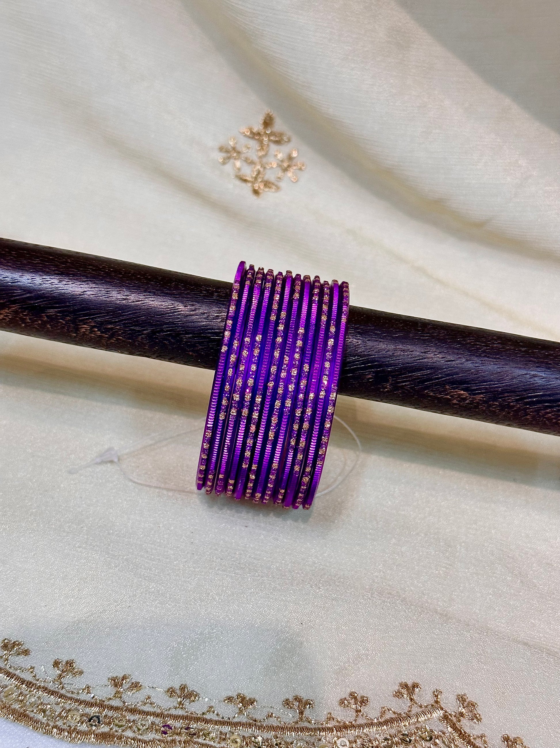 Embellishments: Violet purple gold and silver shimmer metallic bangles