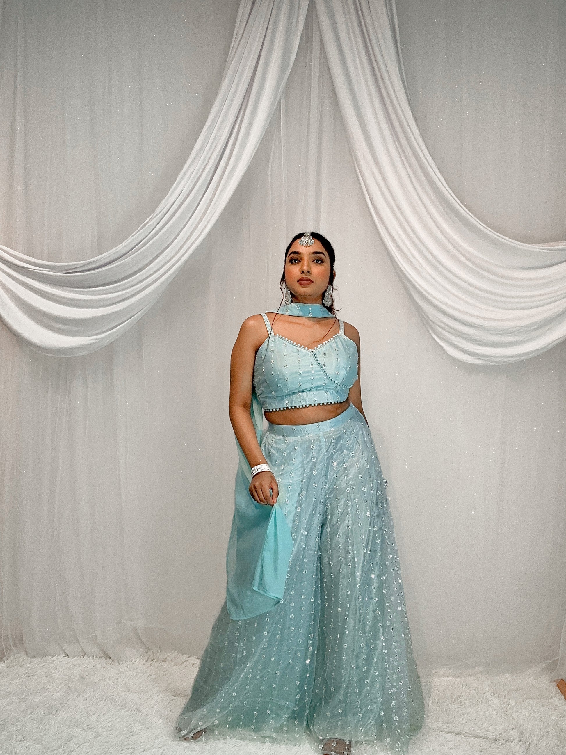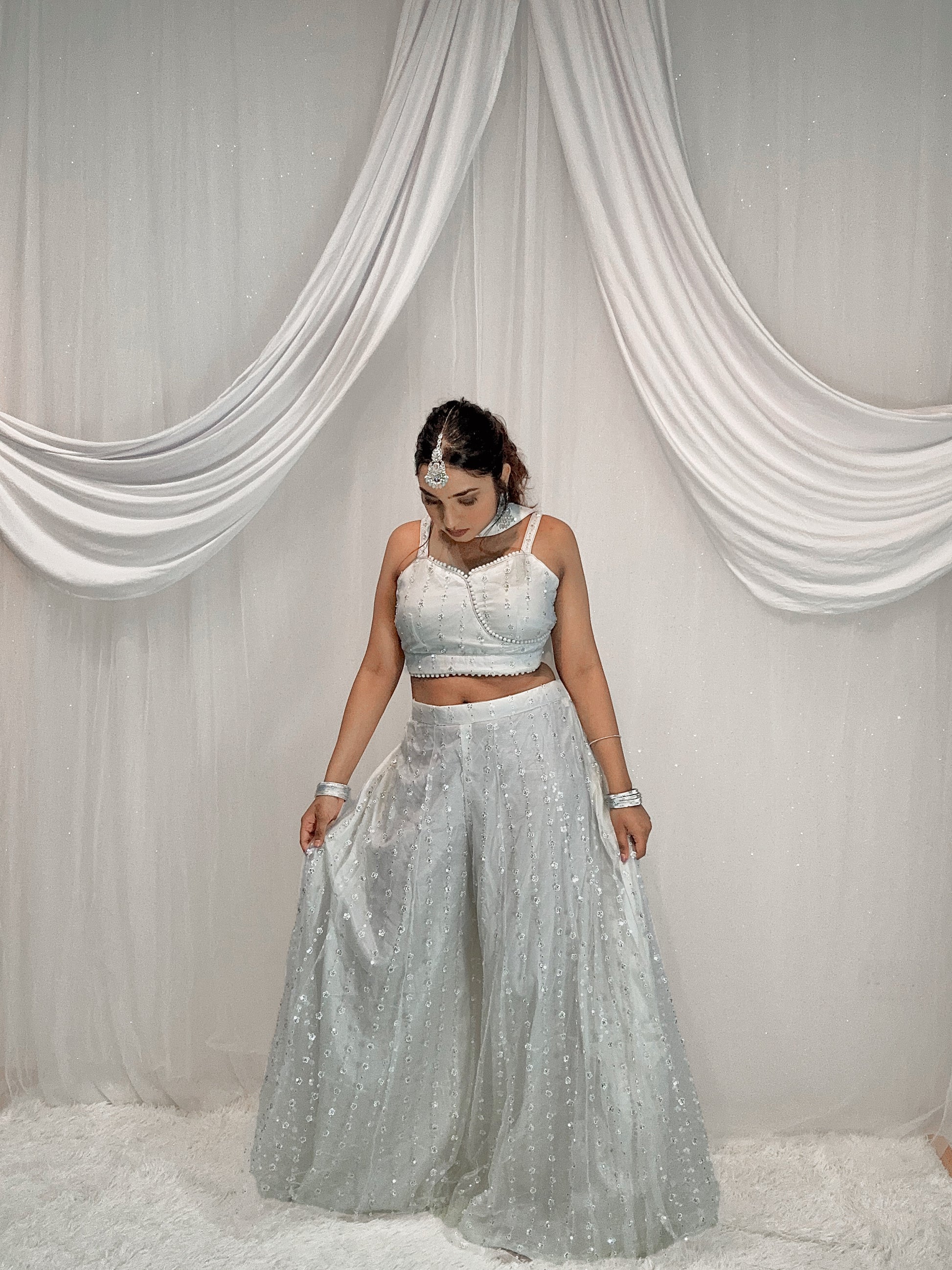 Embellishments: White matte sequins on soft net material, accompanied with a soft georgette material choker shawl embellished with white matte sequins embroidery