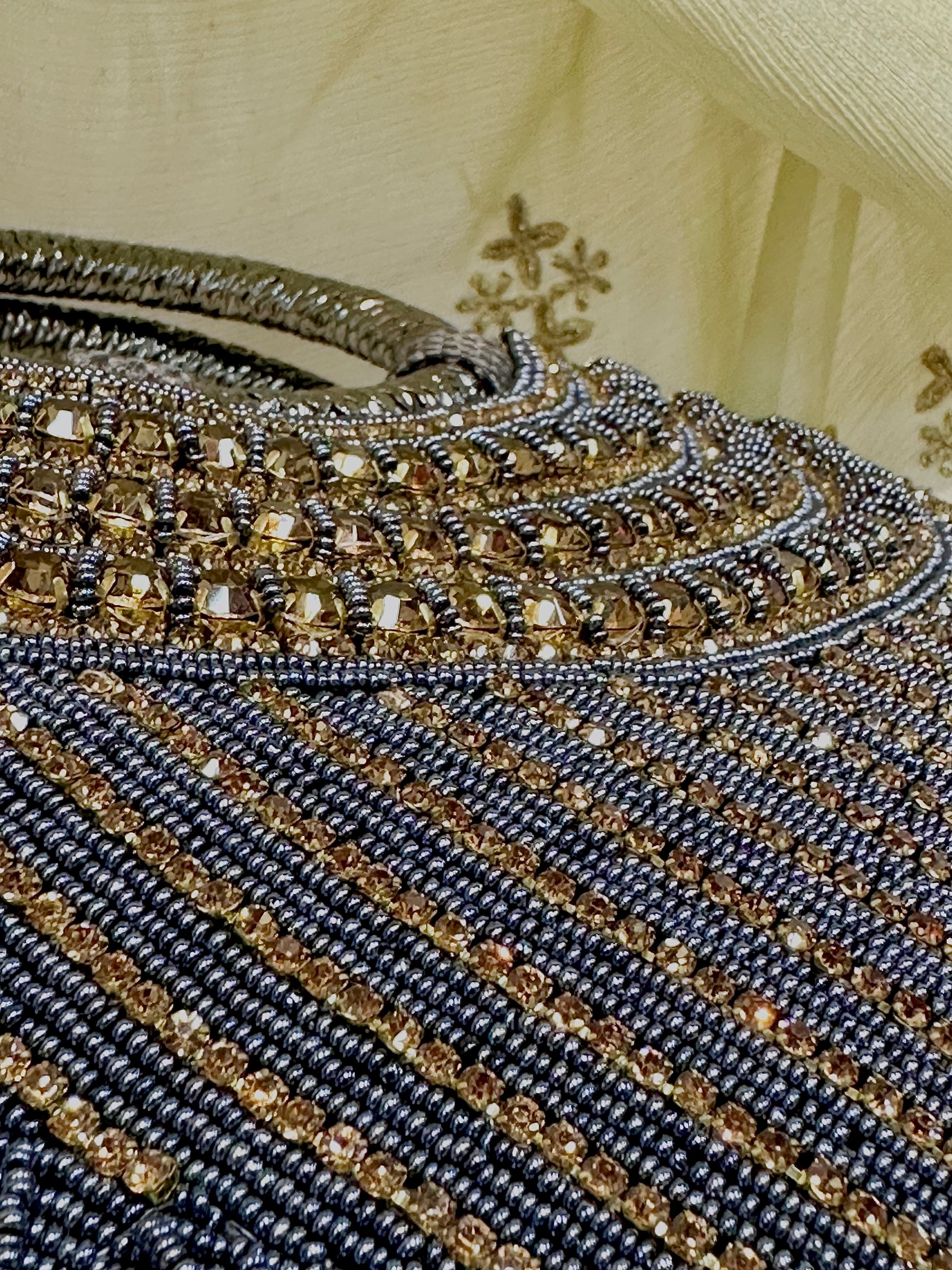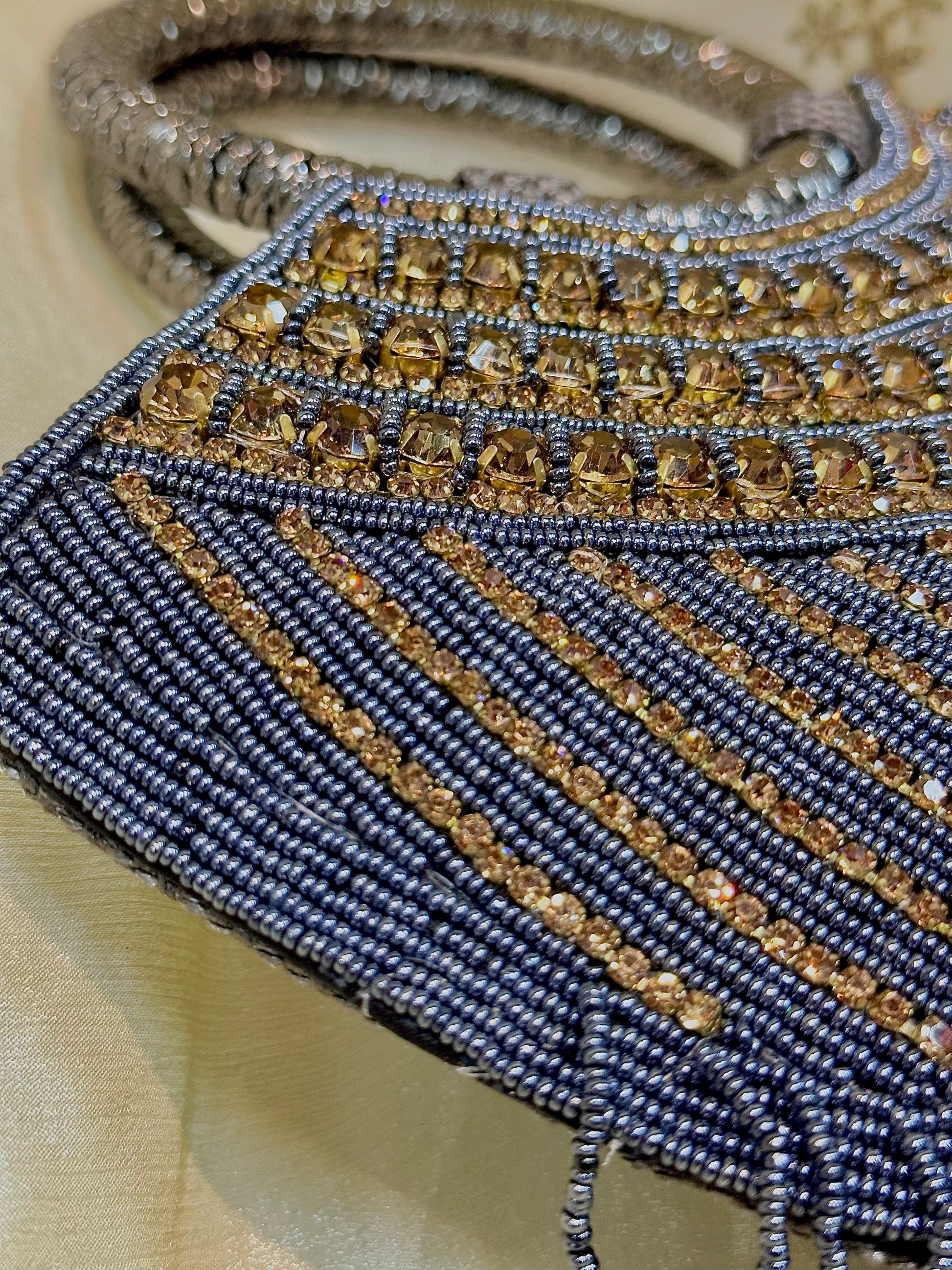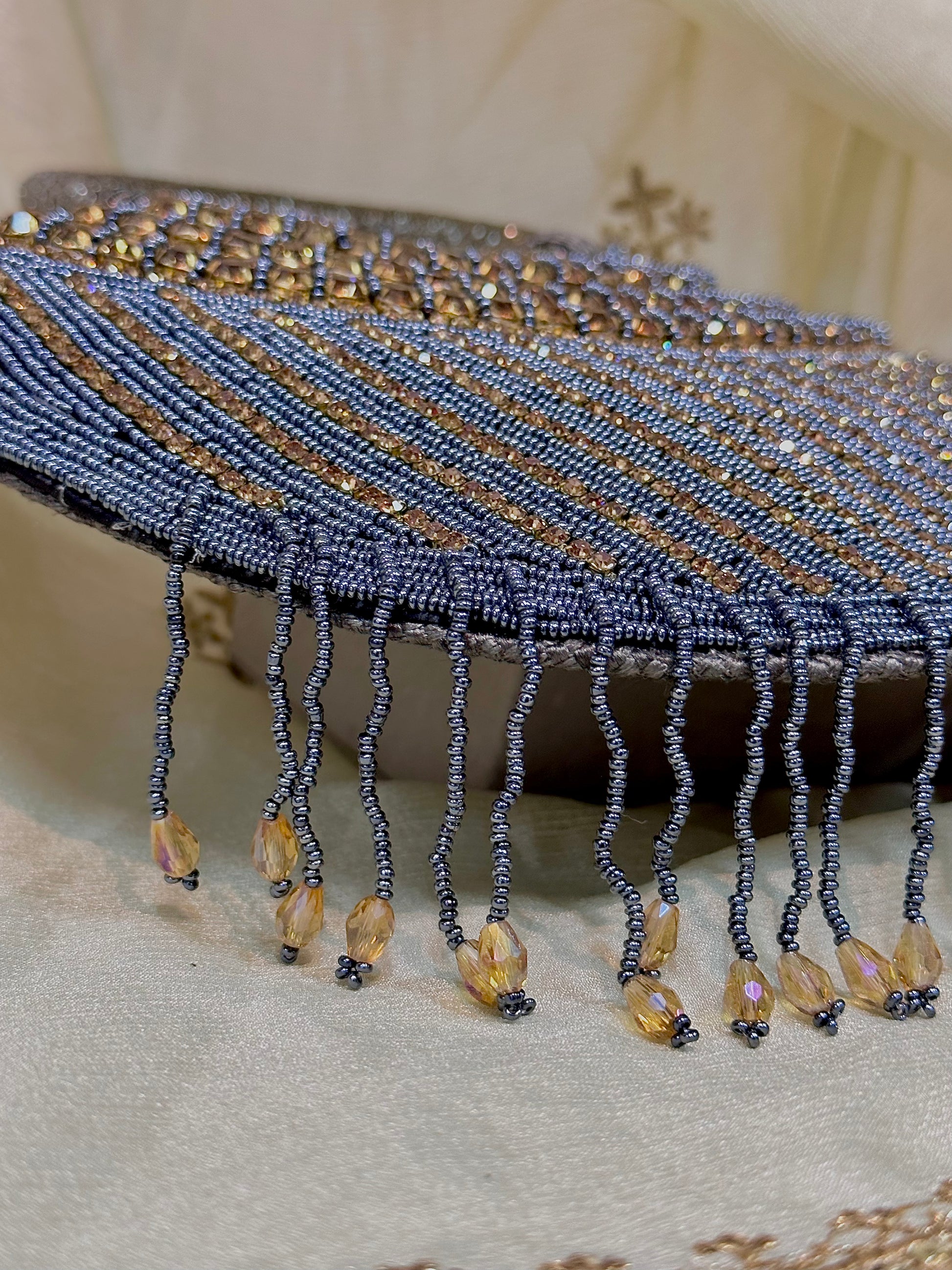 Embellishments: Bronze mini stones, and matte solid grey beads embroidery on fabric, accompanied with large swarovski brown stones. With hanging beaded crystals. The back of clutch is made with knitted material with a zipper compartment.