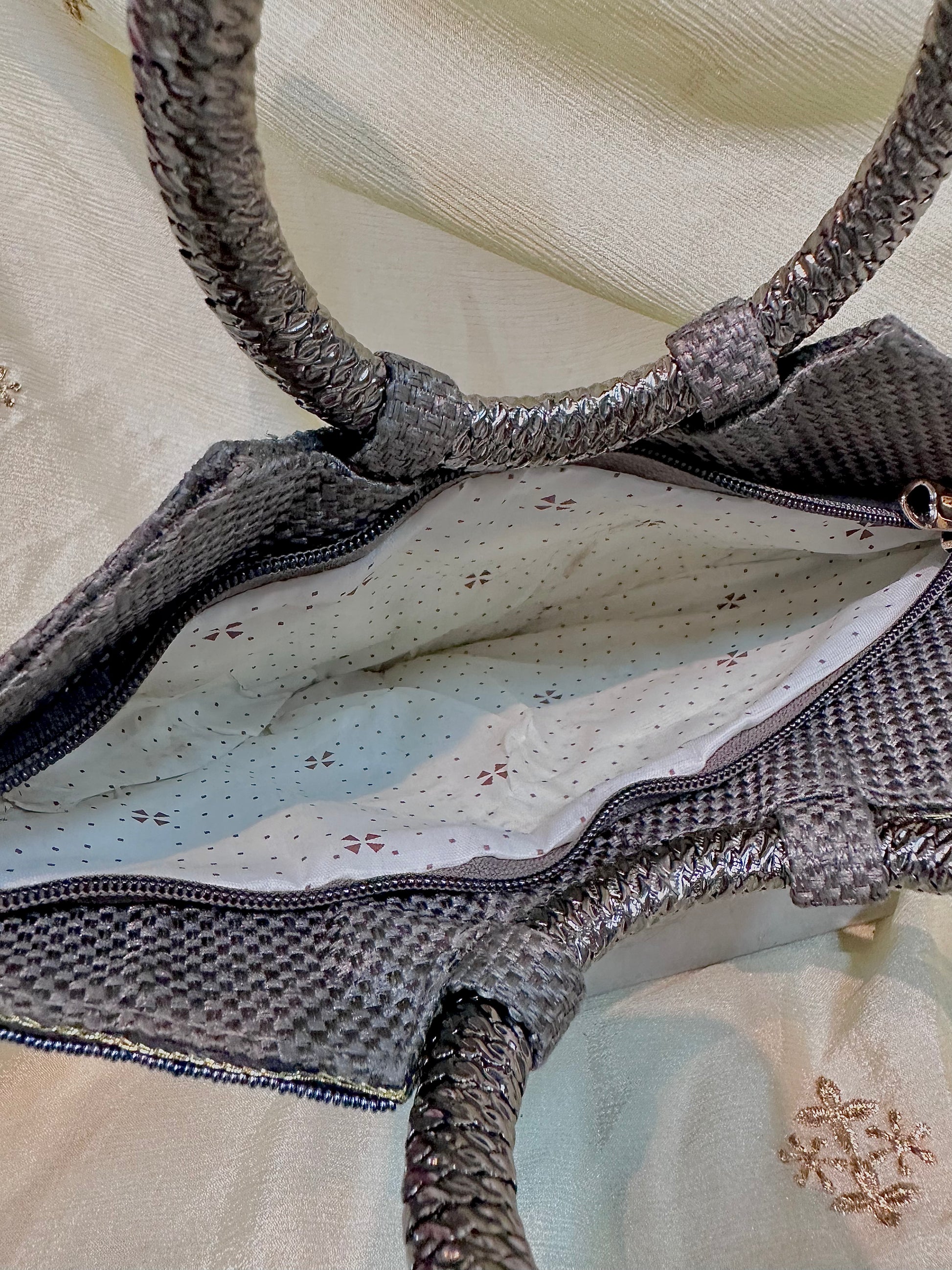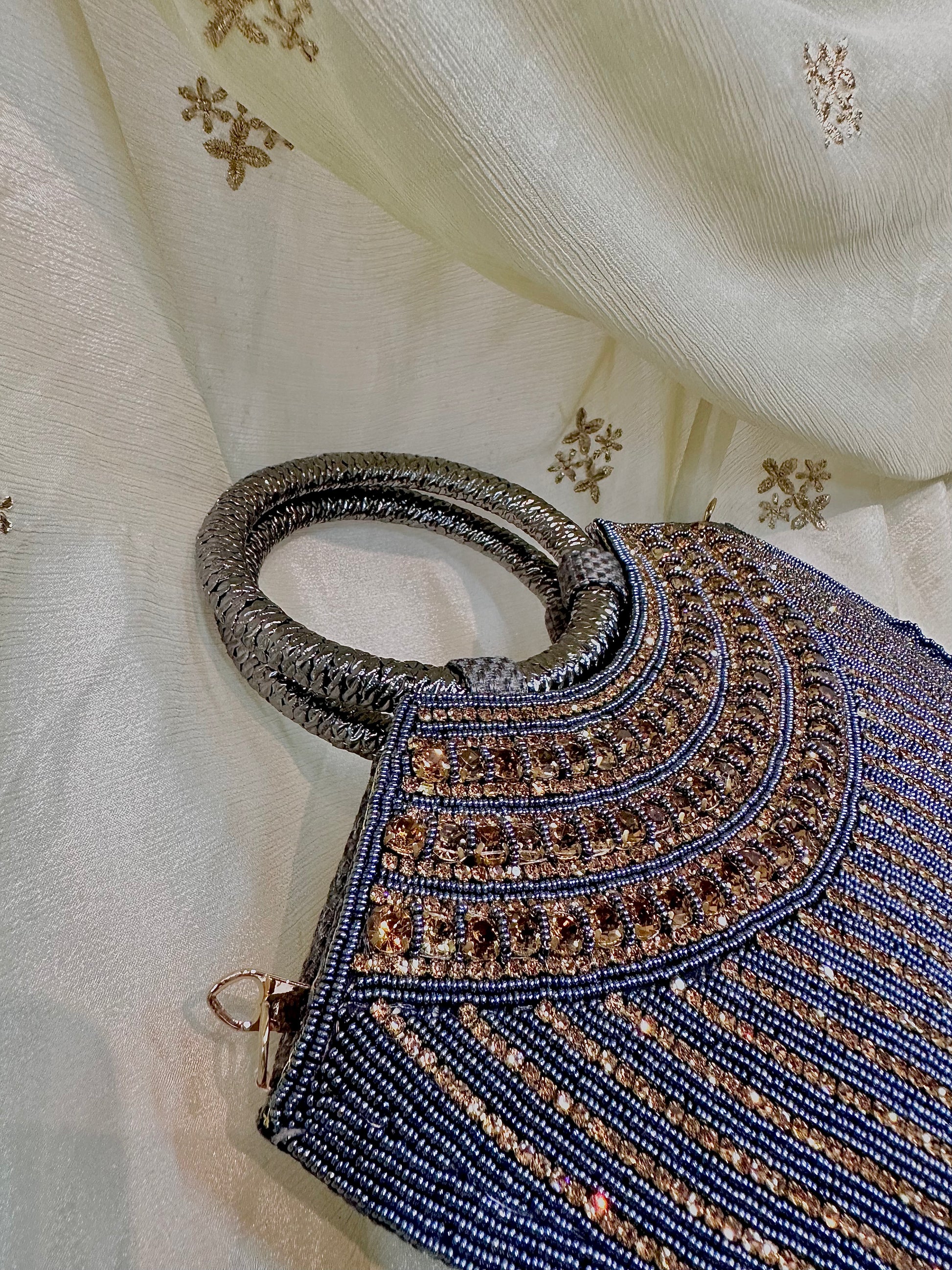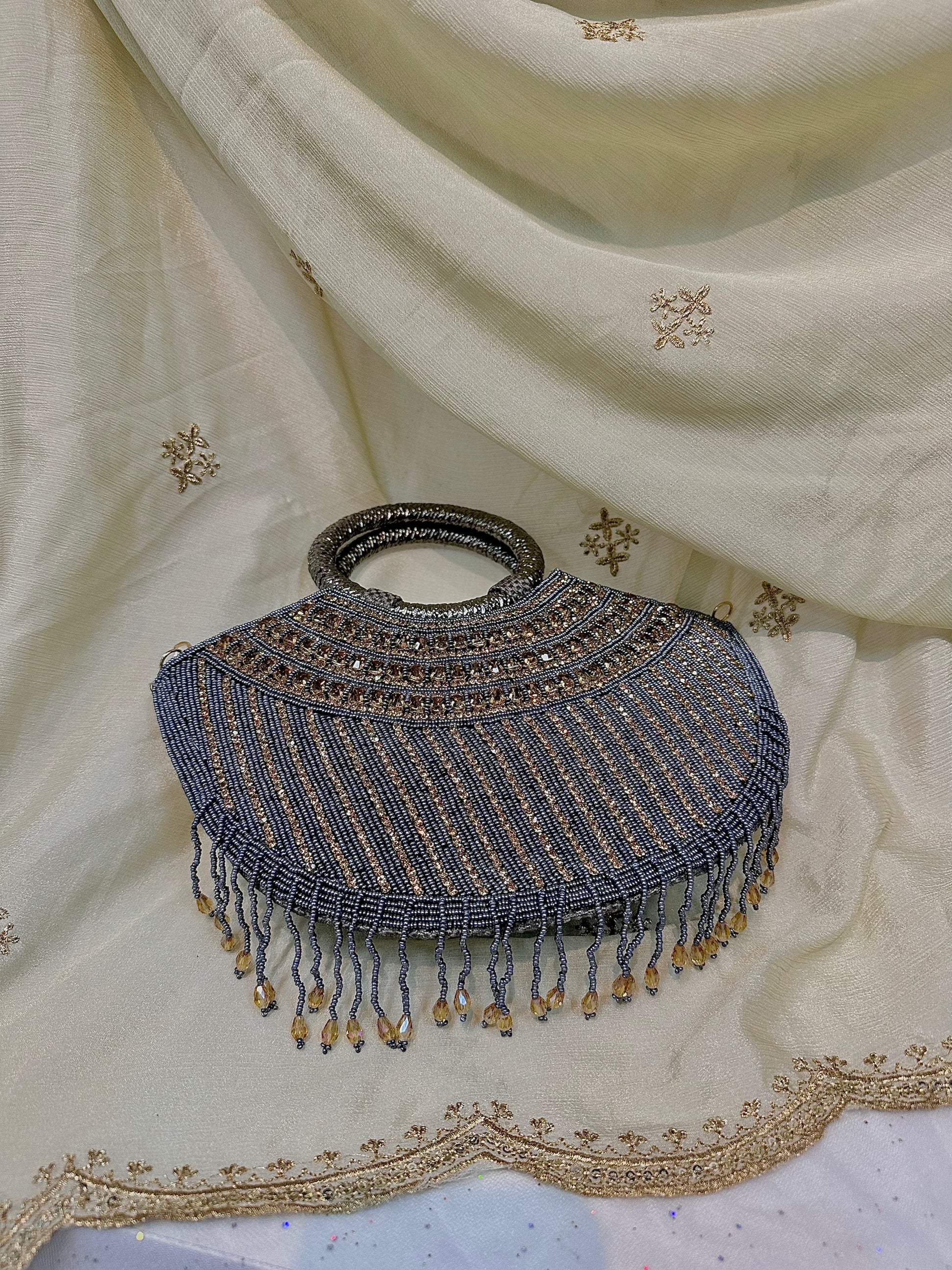 Embellishments: Bronze mini stones, and matte solid grey beads embroidery on fabric, accompanied with large swarovski brown stones. With hanging beaded crystals. The back of clutch is made with knitted material with a zipper compartment.