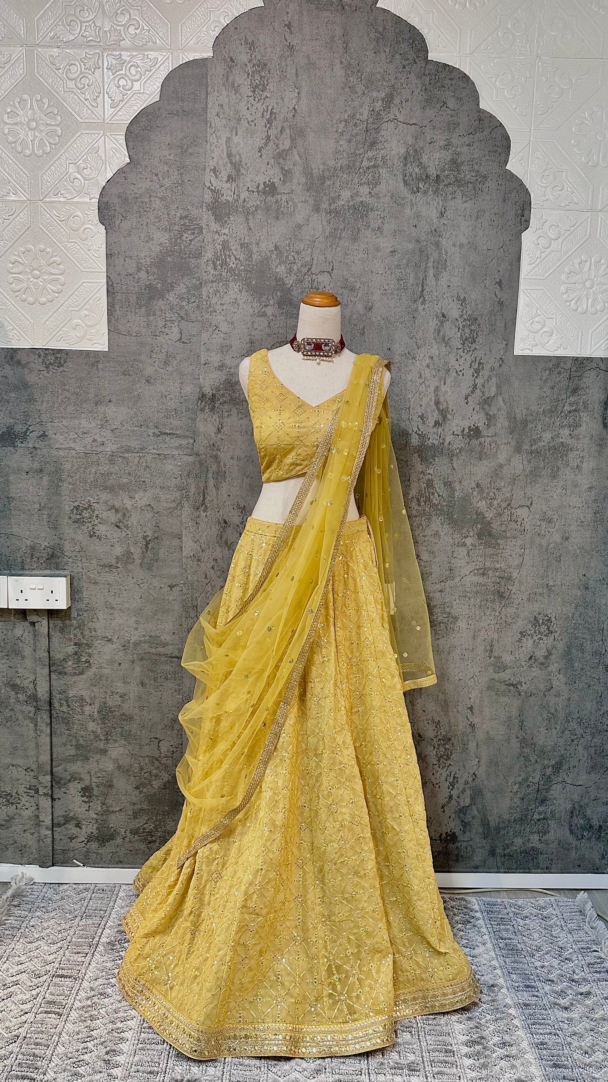 Embellishments: Champagne gold sequins on gold material with champagne gold border, accompanied with a soft net material shawl embellished with champagne gold sequins embroidery.
