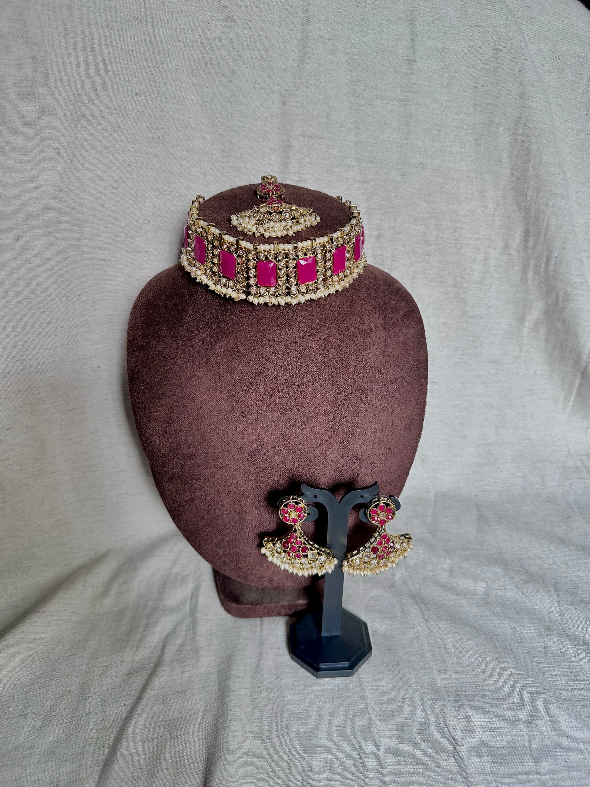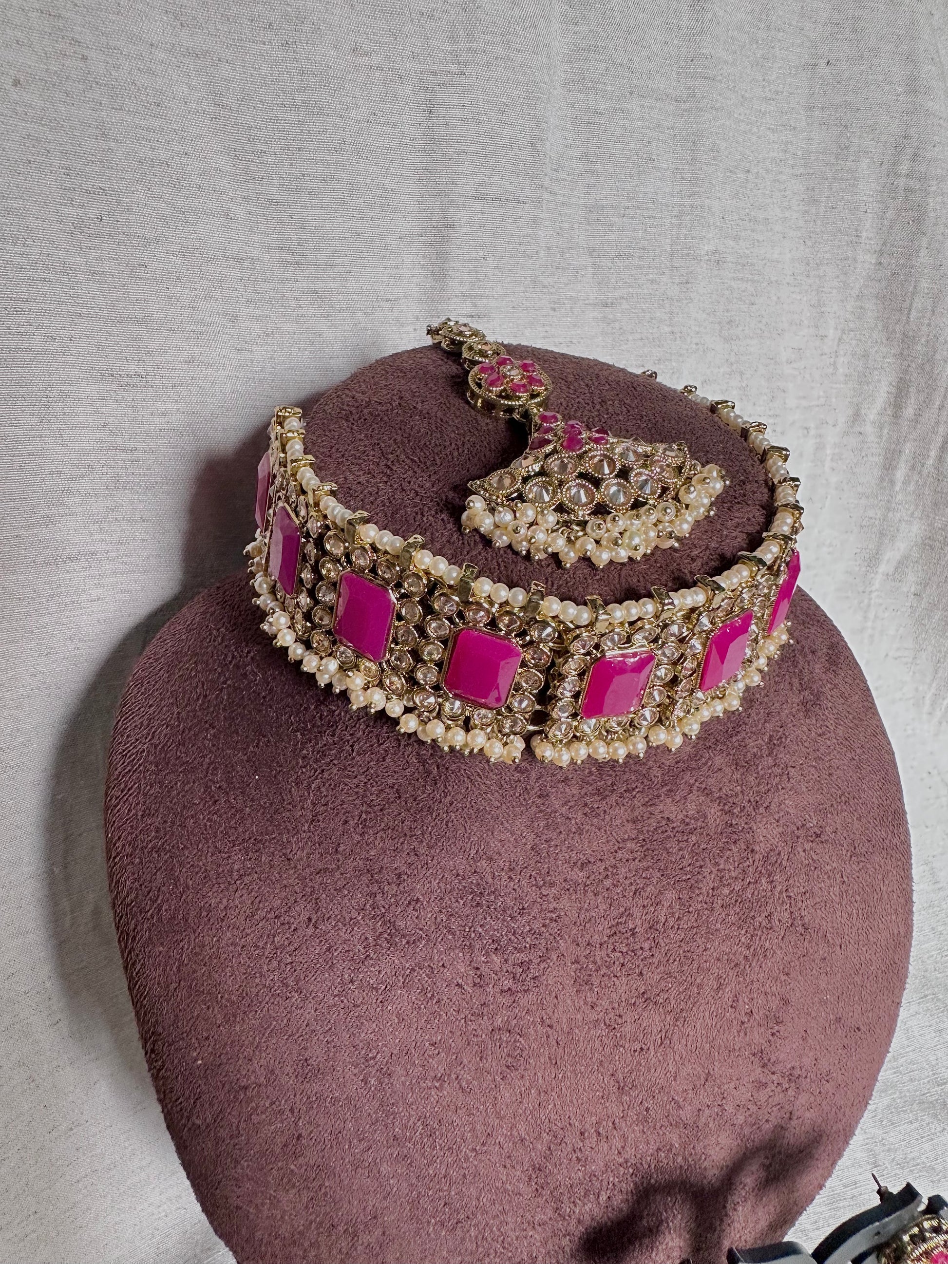 Embellishments: Giold base with hot pink and mehandi polished stones.