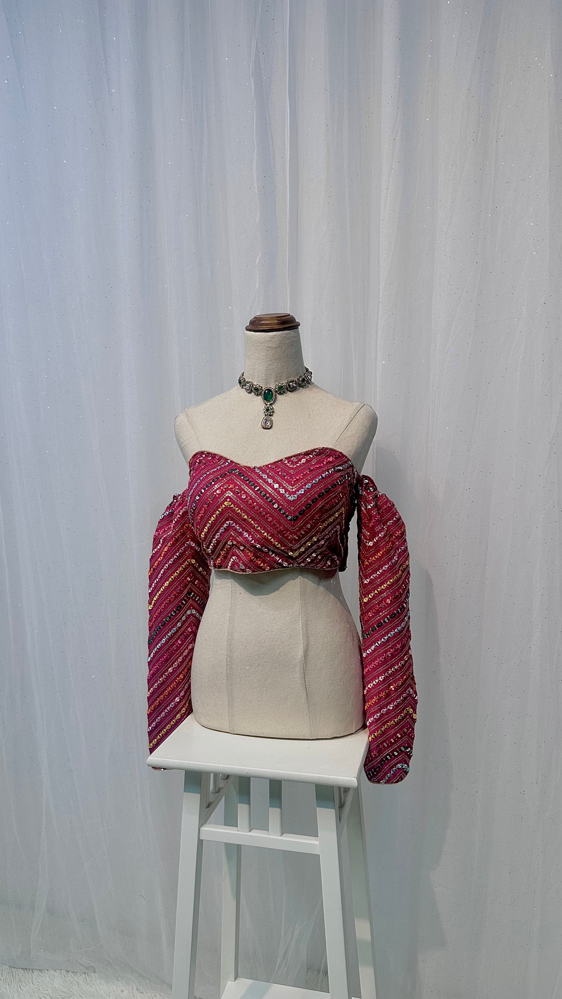 Embellishments: Pastel multicolor sequins on pink based georgette material ready made blouse.
