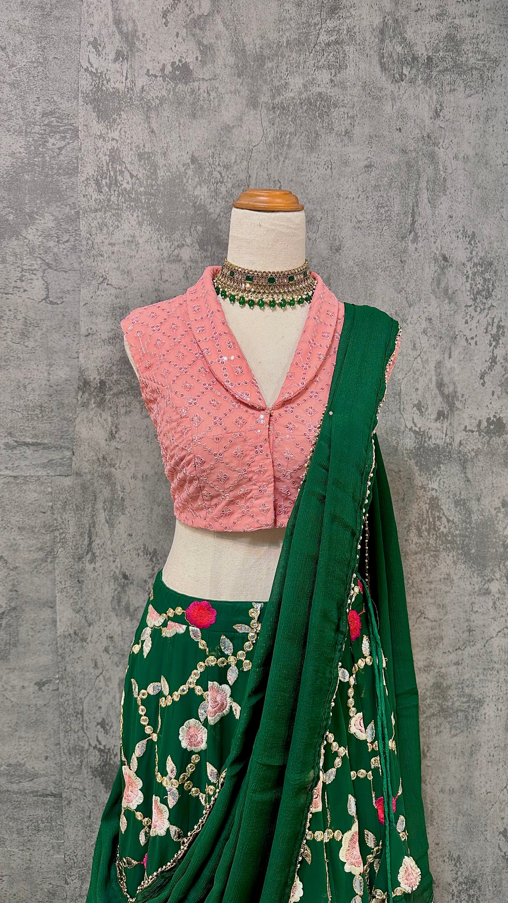 Embellishments: Kotapati on emerald georgette material with champagne gold border, accompanied with a georgette material plain shawl embellished with champagne gold beaded border. Blouse is made with embroidery work on peach material.
