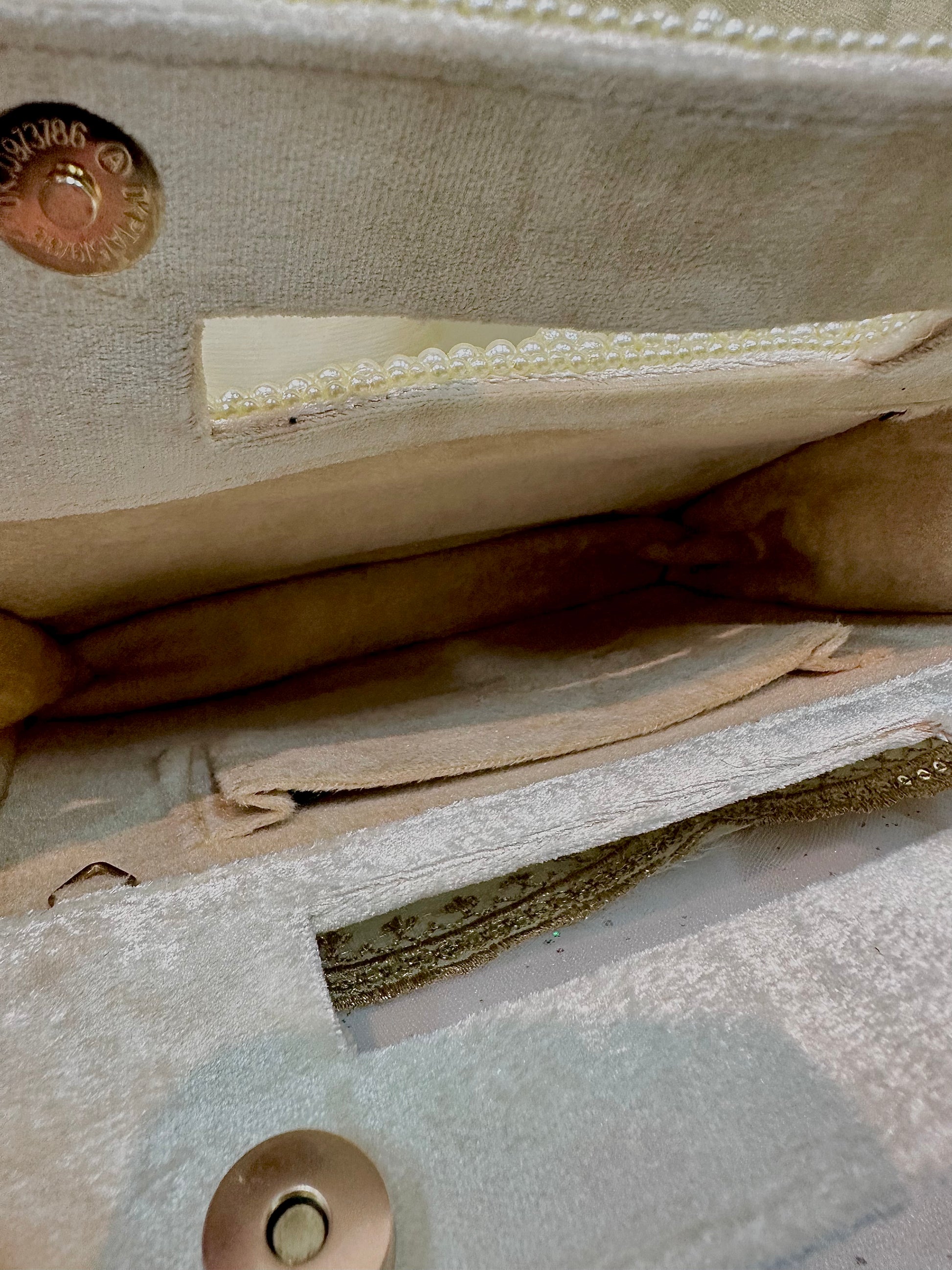 Embellishments: Cream pearls and beads embroidery on fabric, accompanied with large swarovski stones. Back of the clutch is made with velvet fabric.