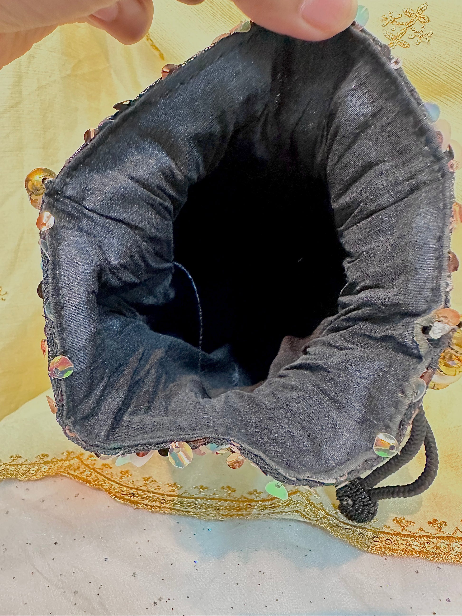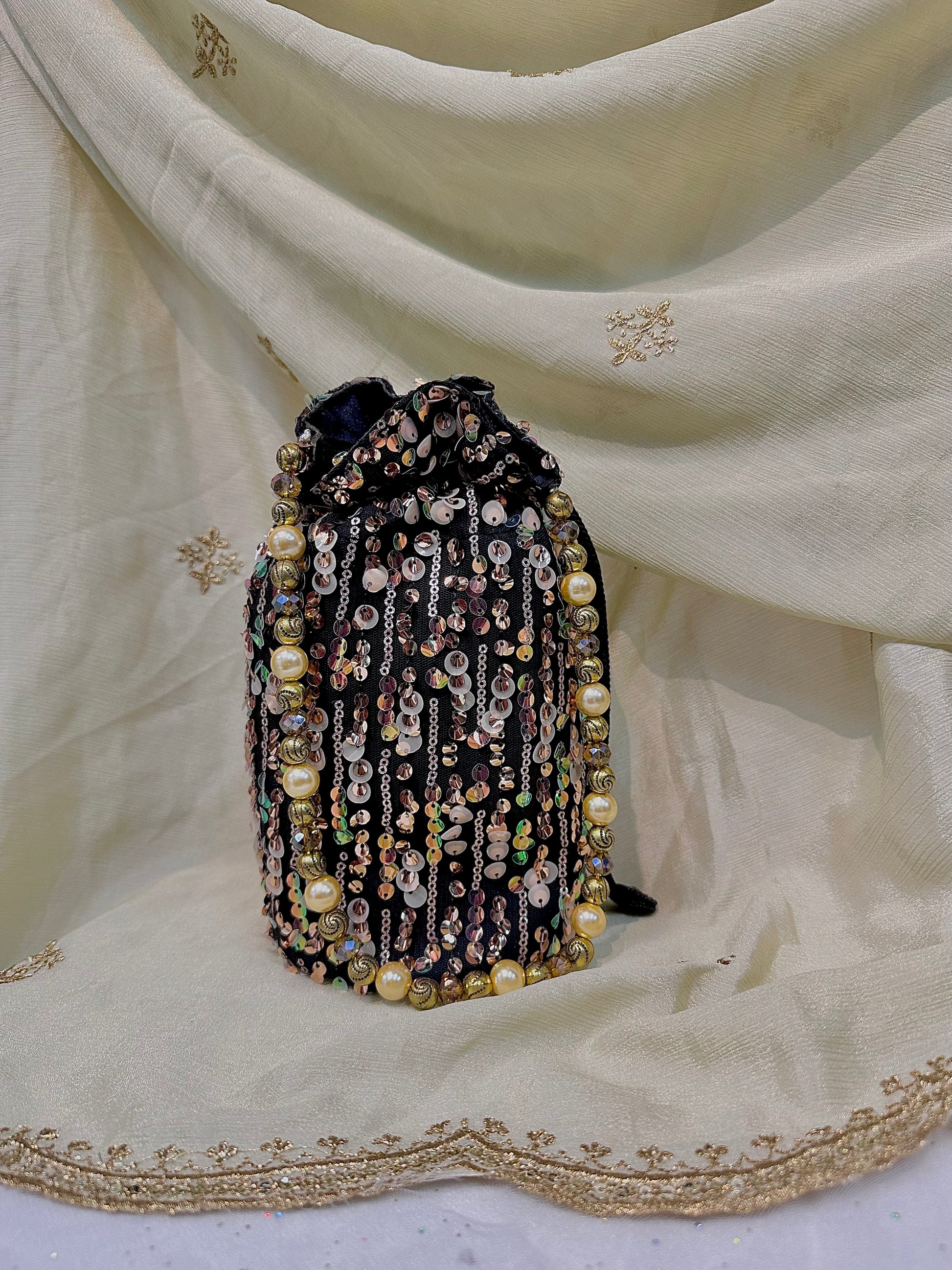 Embellishments: Shades of brown sequins embroidery on silk fabric. Best part of owning a potli, the design is 360.