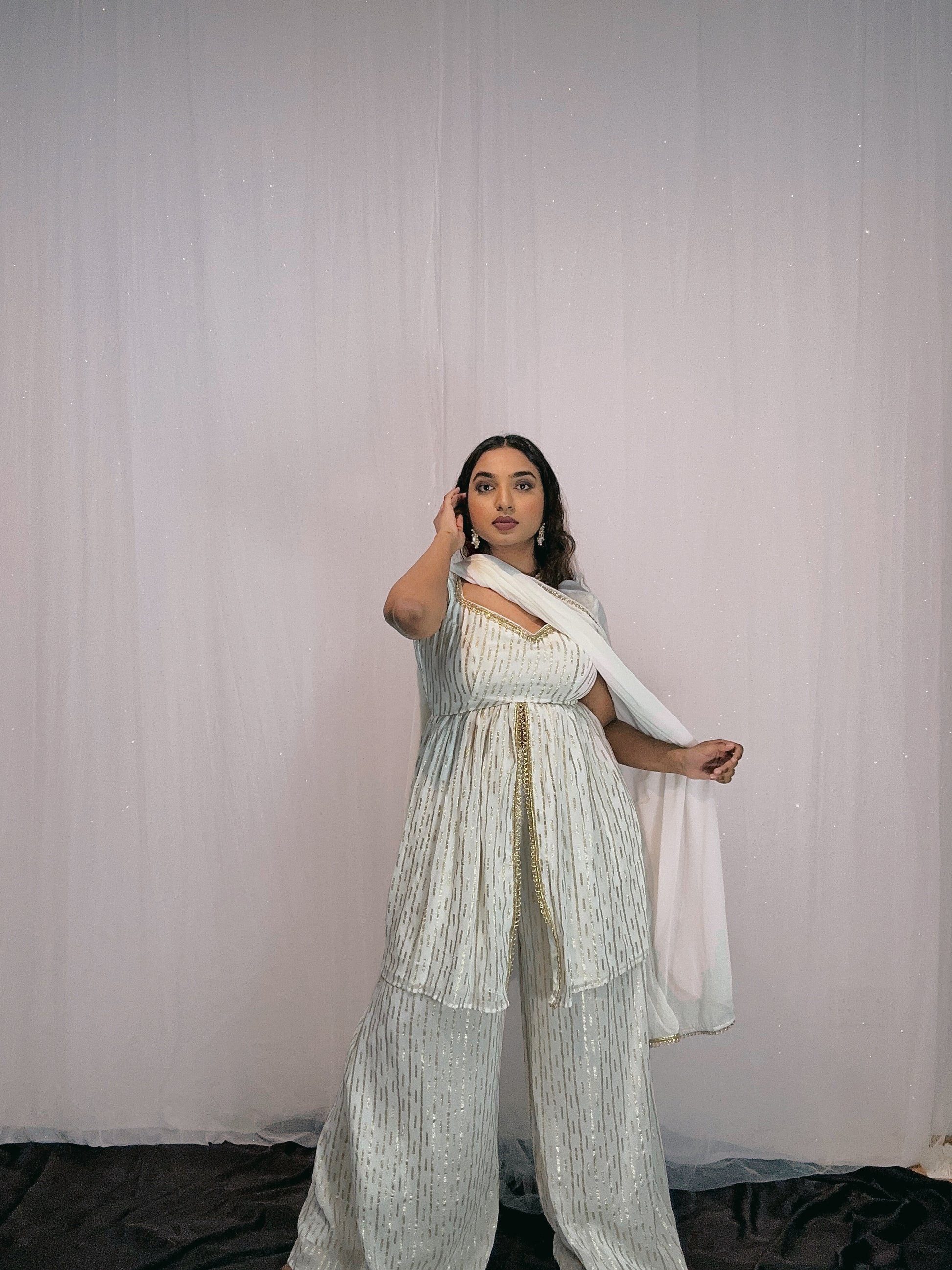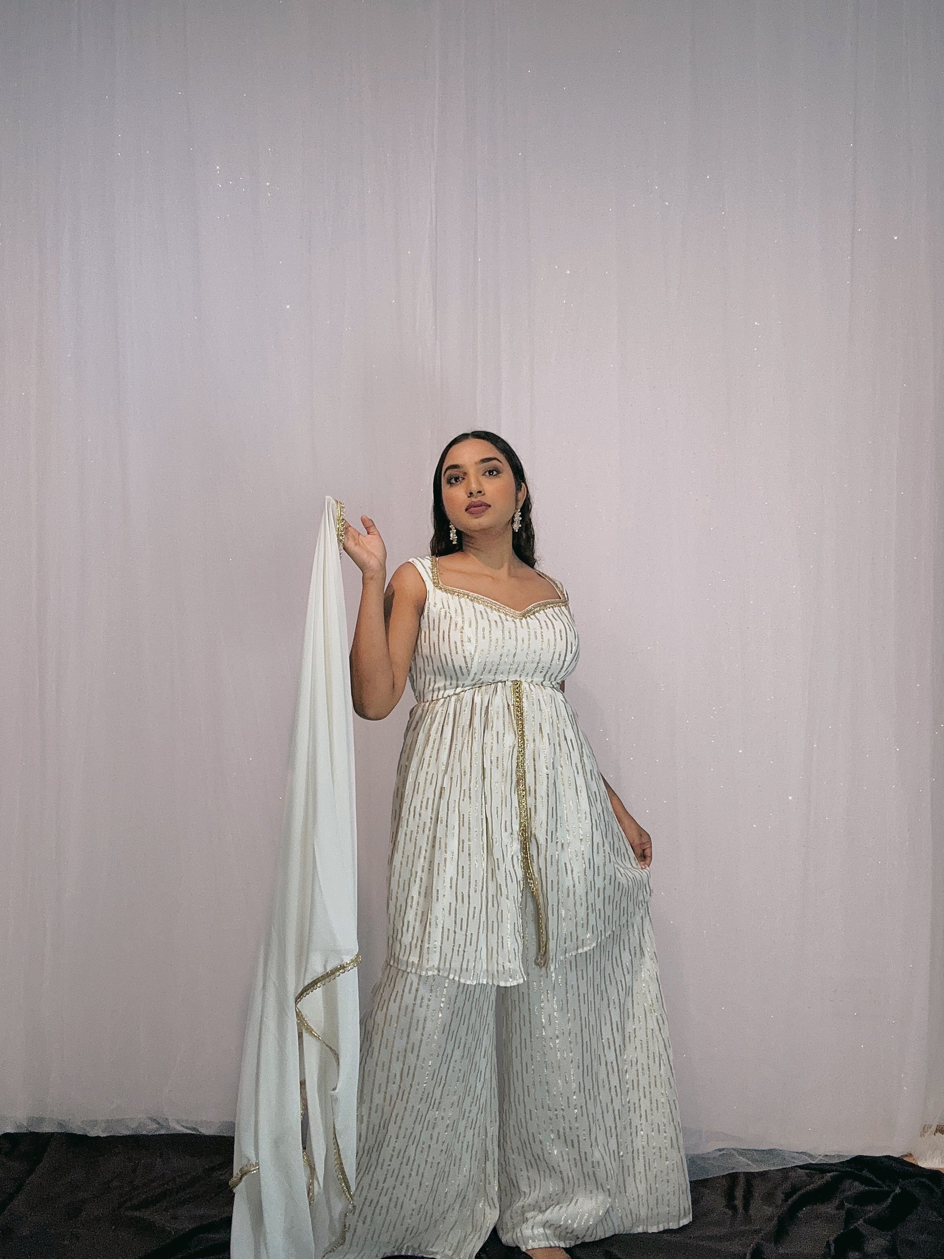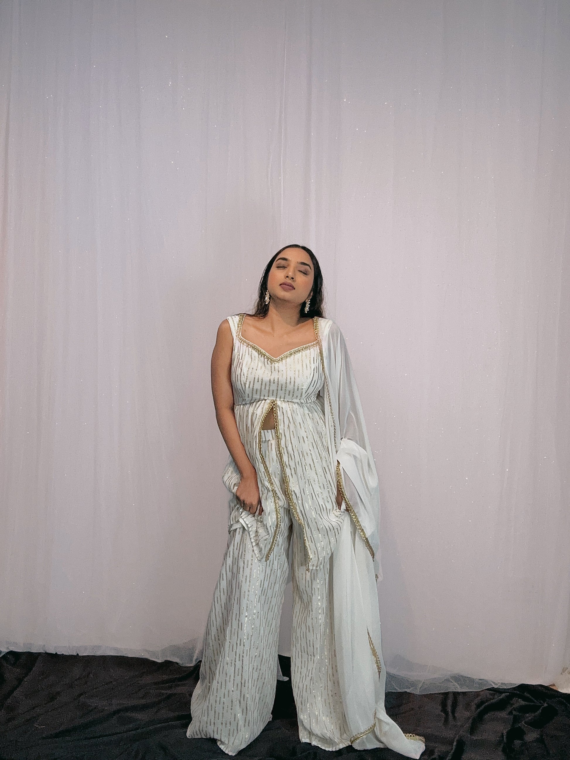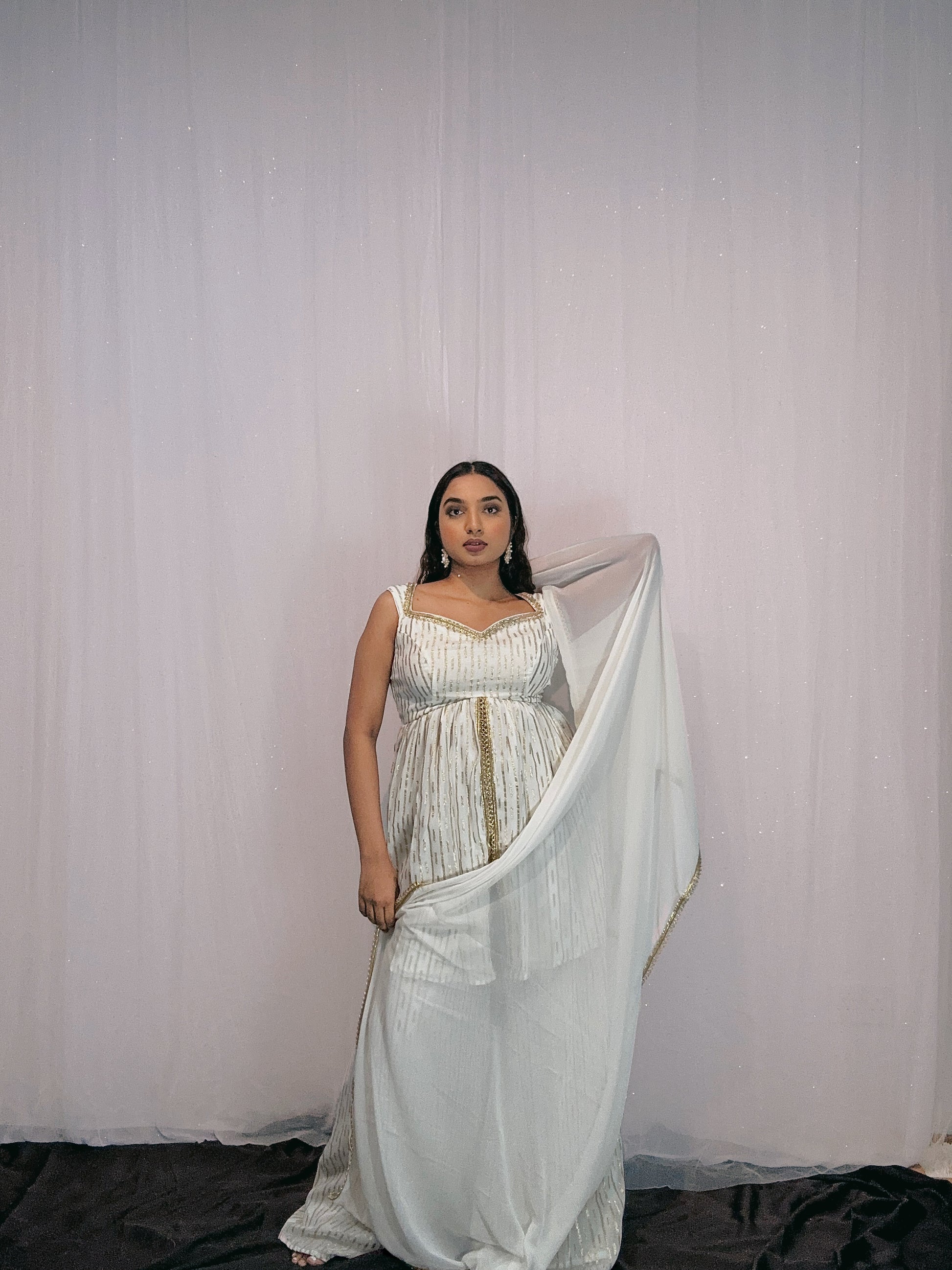 Embellishments: Champagne gold sequins on banaras material with champagne gold border, accompanied with a georgette material shawl embellished with champagne gold embroidery
