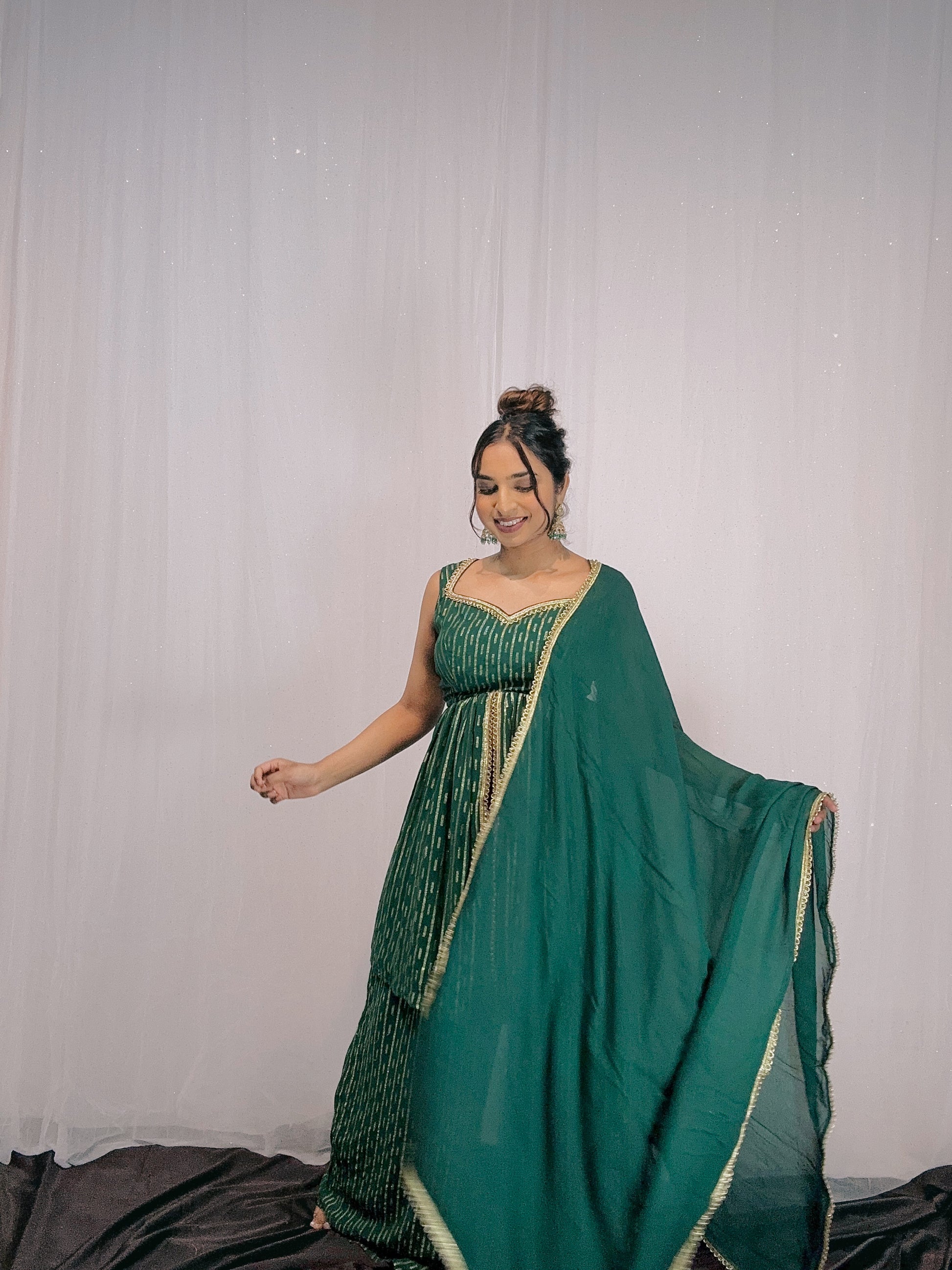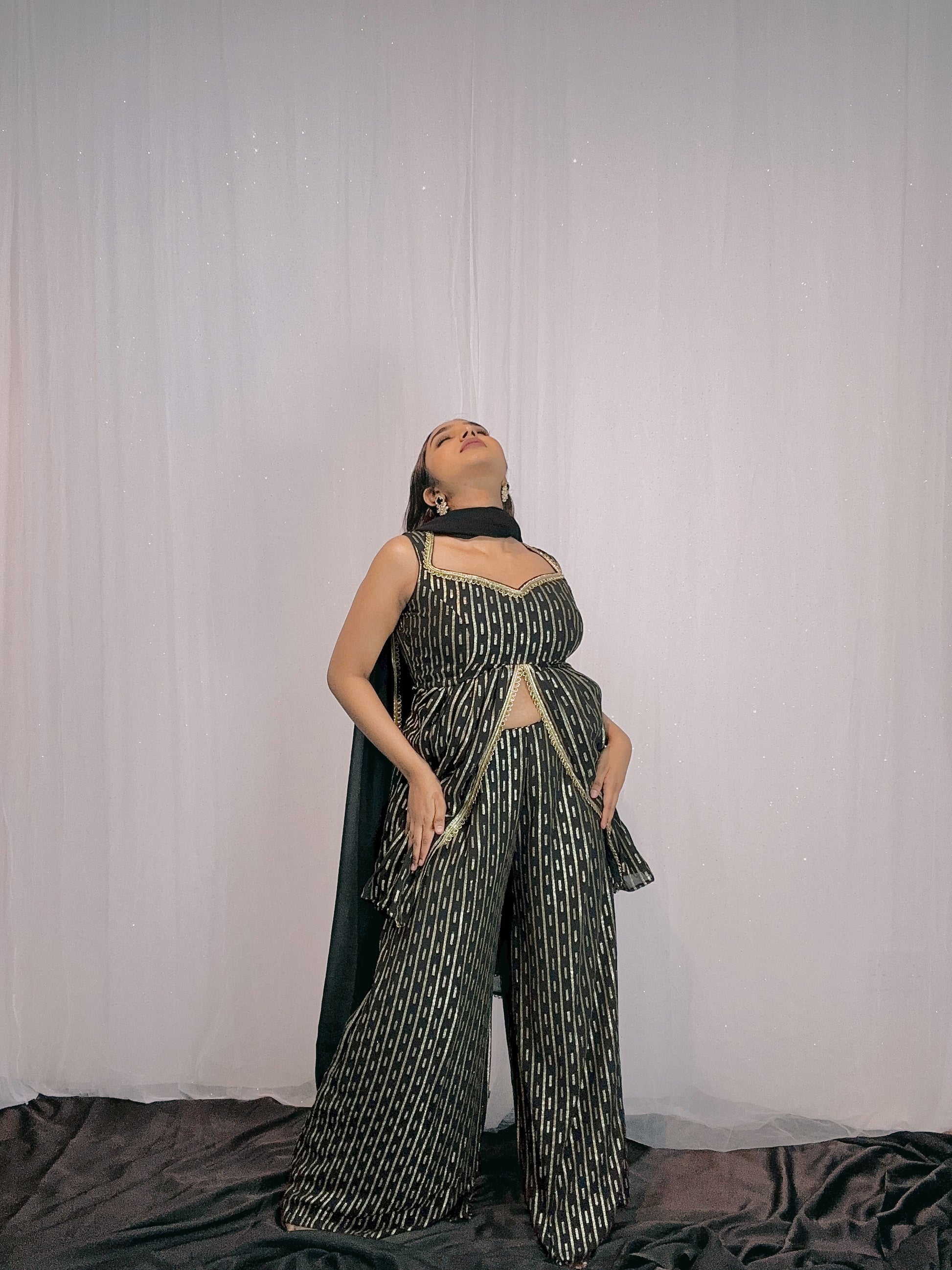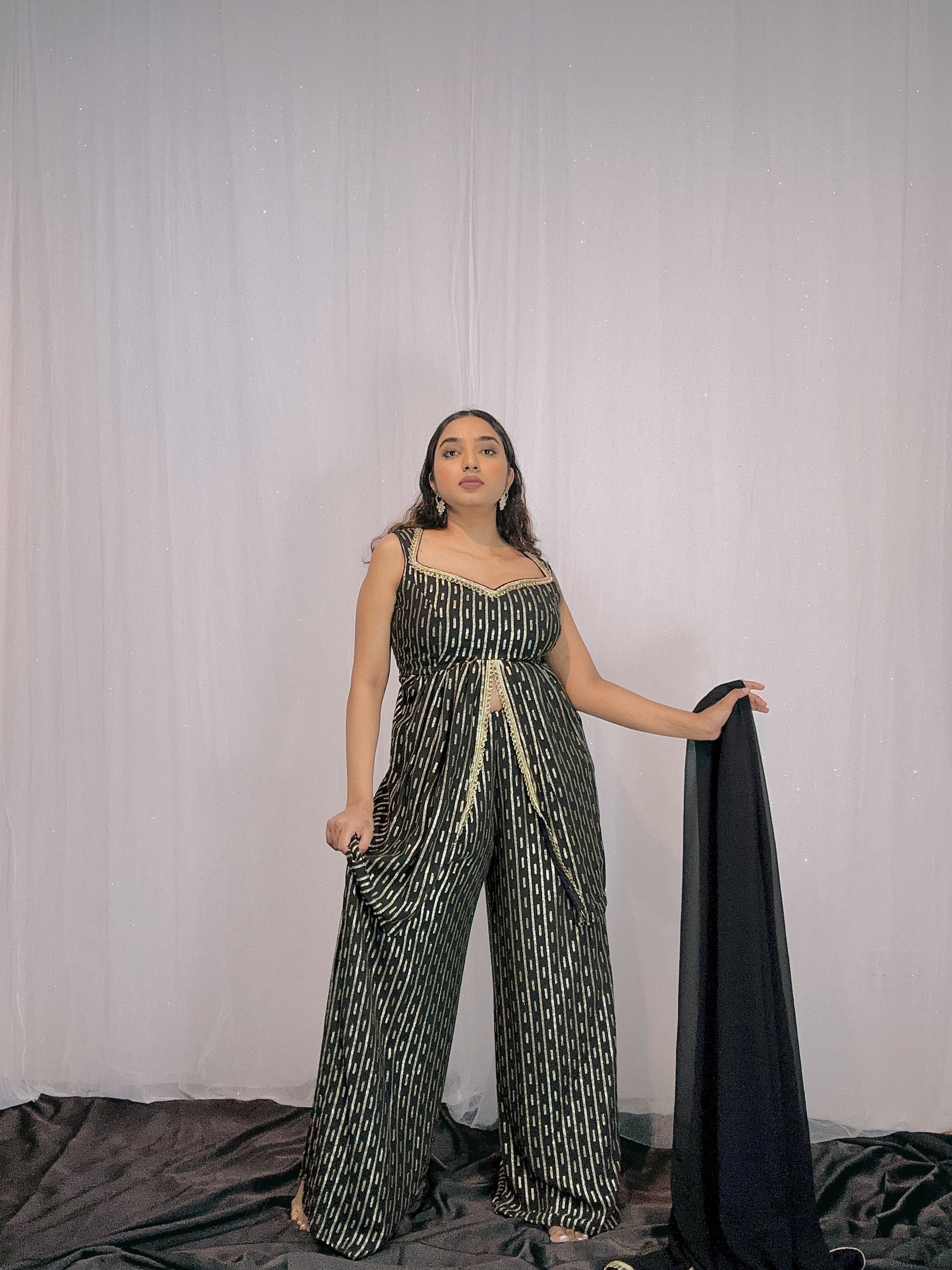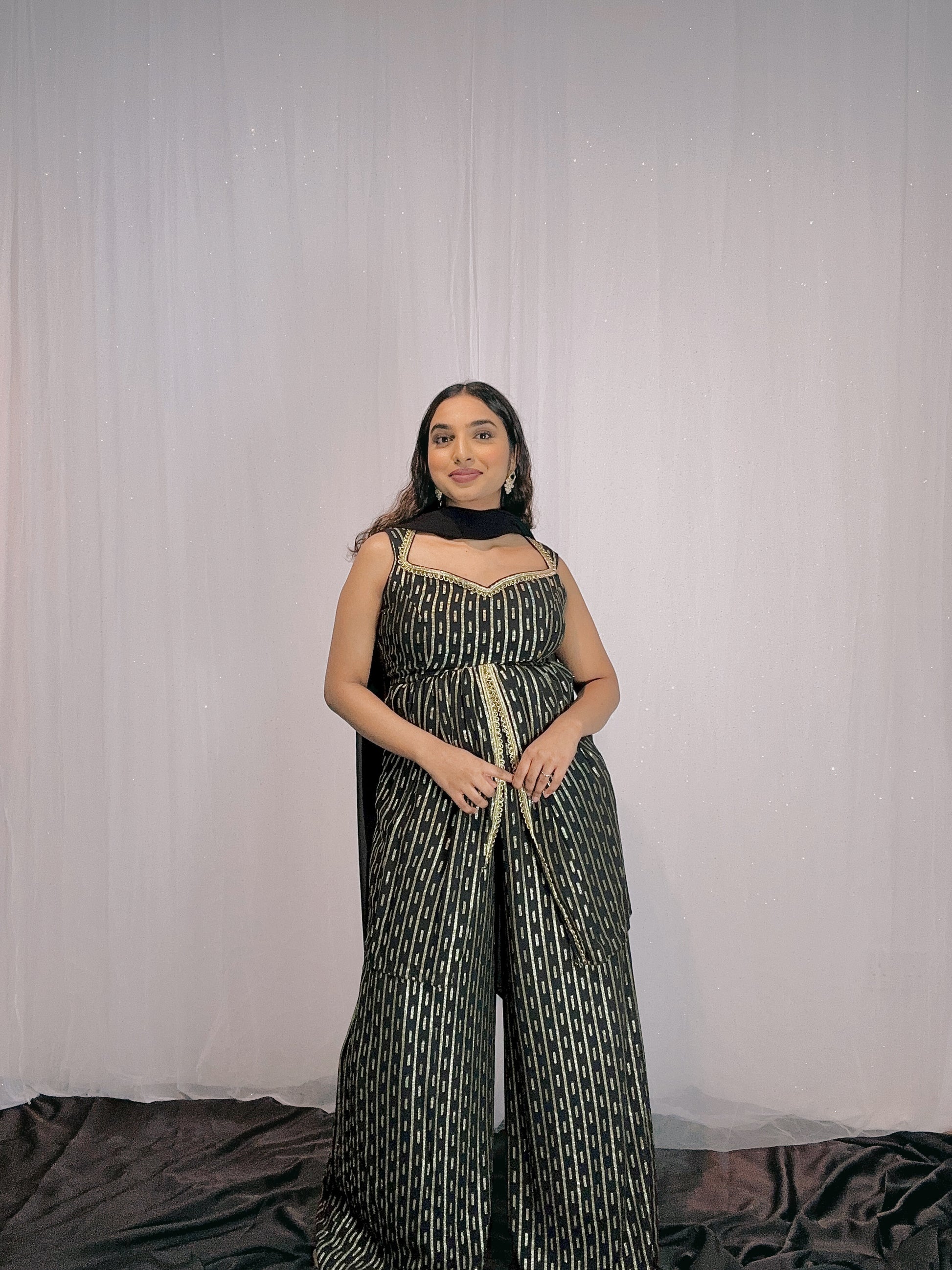 Embellishments: Champagne gold sequins on banaras material with champagne gold border, accompanied with a georgette material shawl embellished with champagne gold embroidery