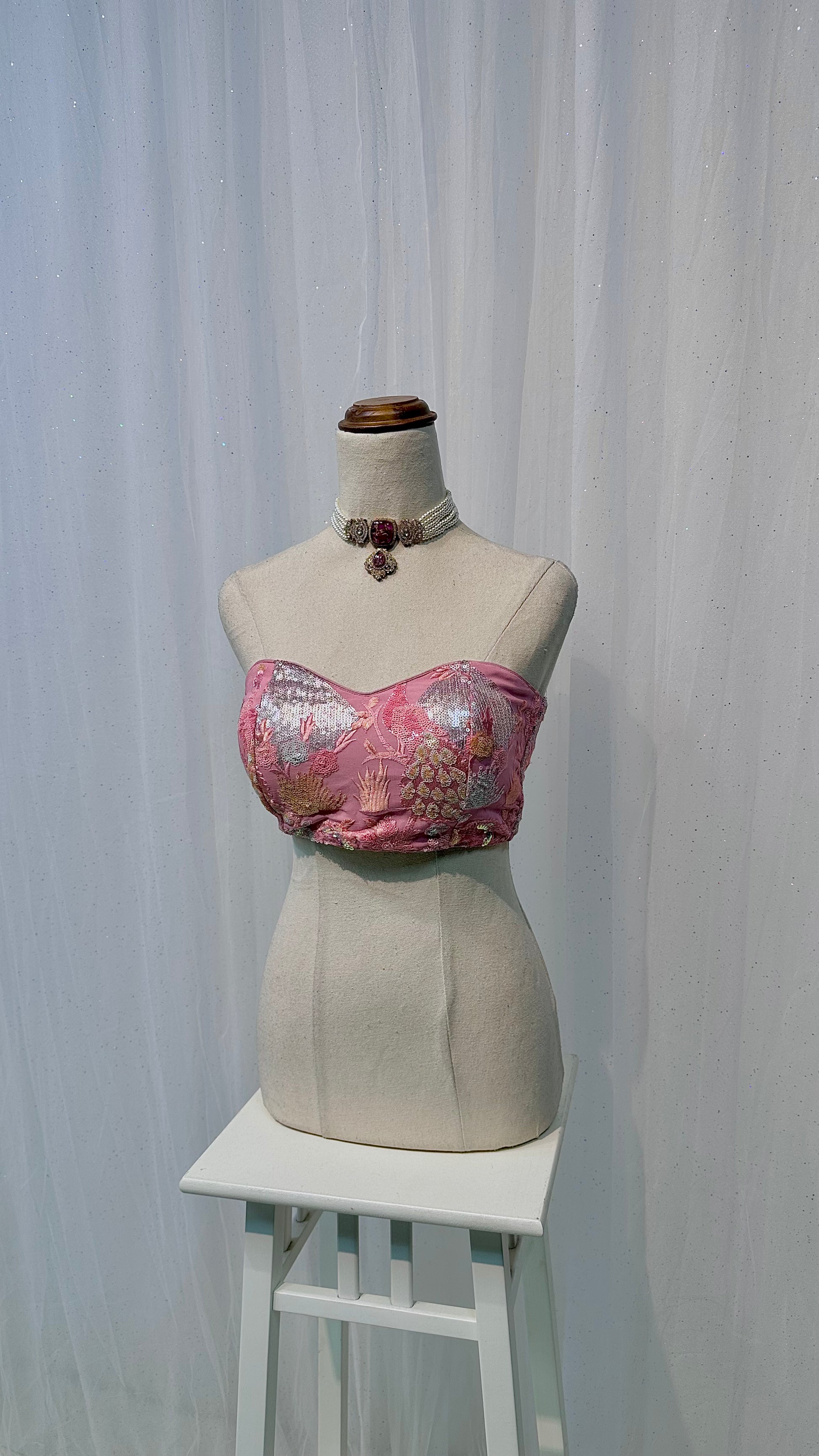 Embellishments: Pastel multicolor sequins on baby pink based georgette material ready made blouse.