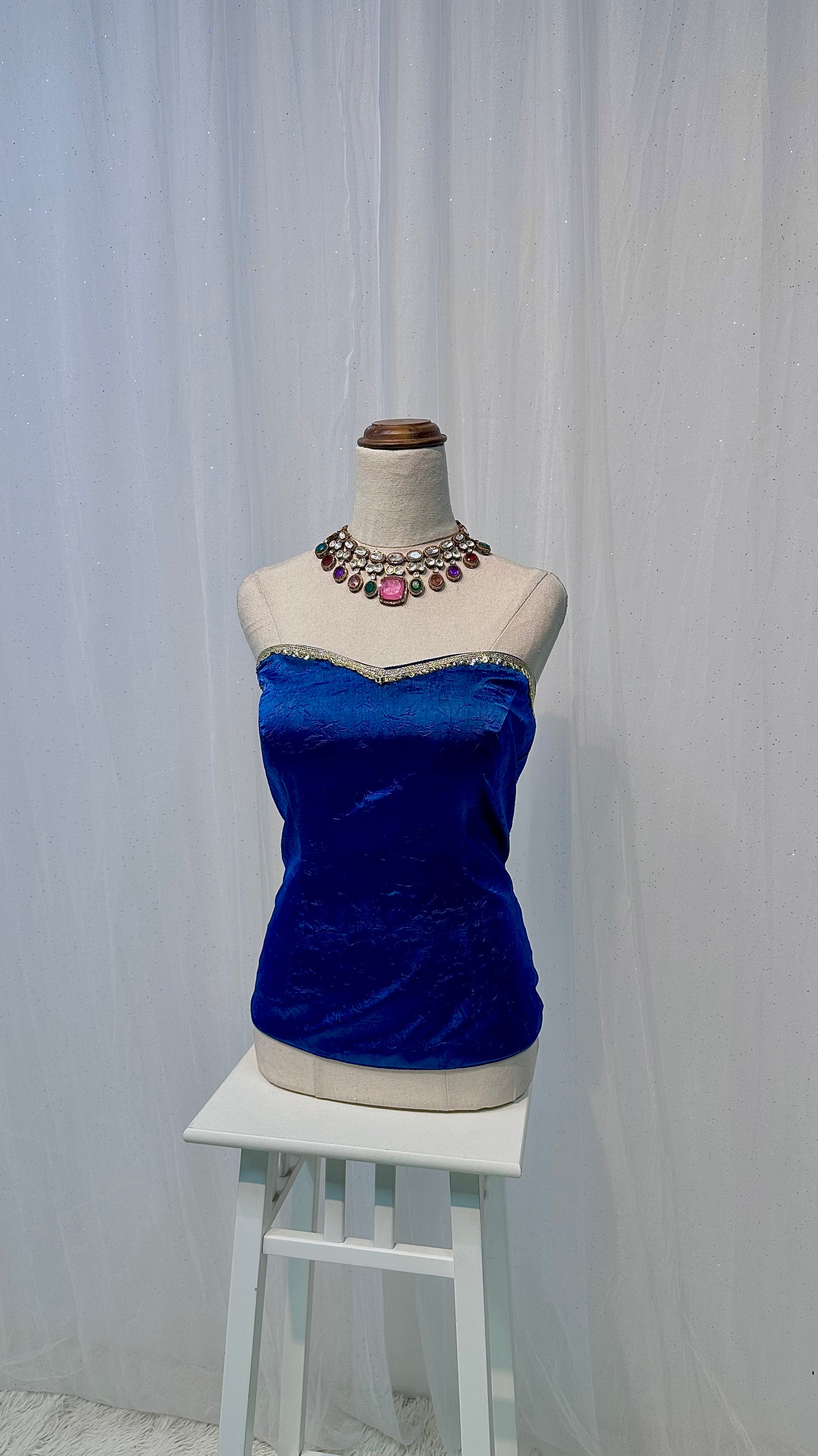Embellishments: Plain blue based georgette material ready made blouse.