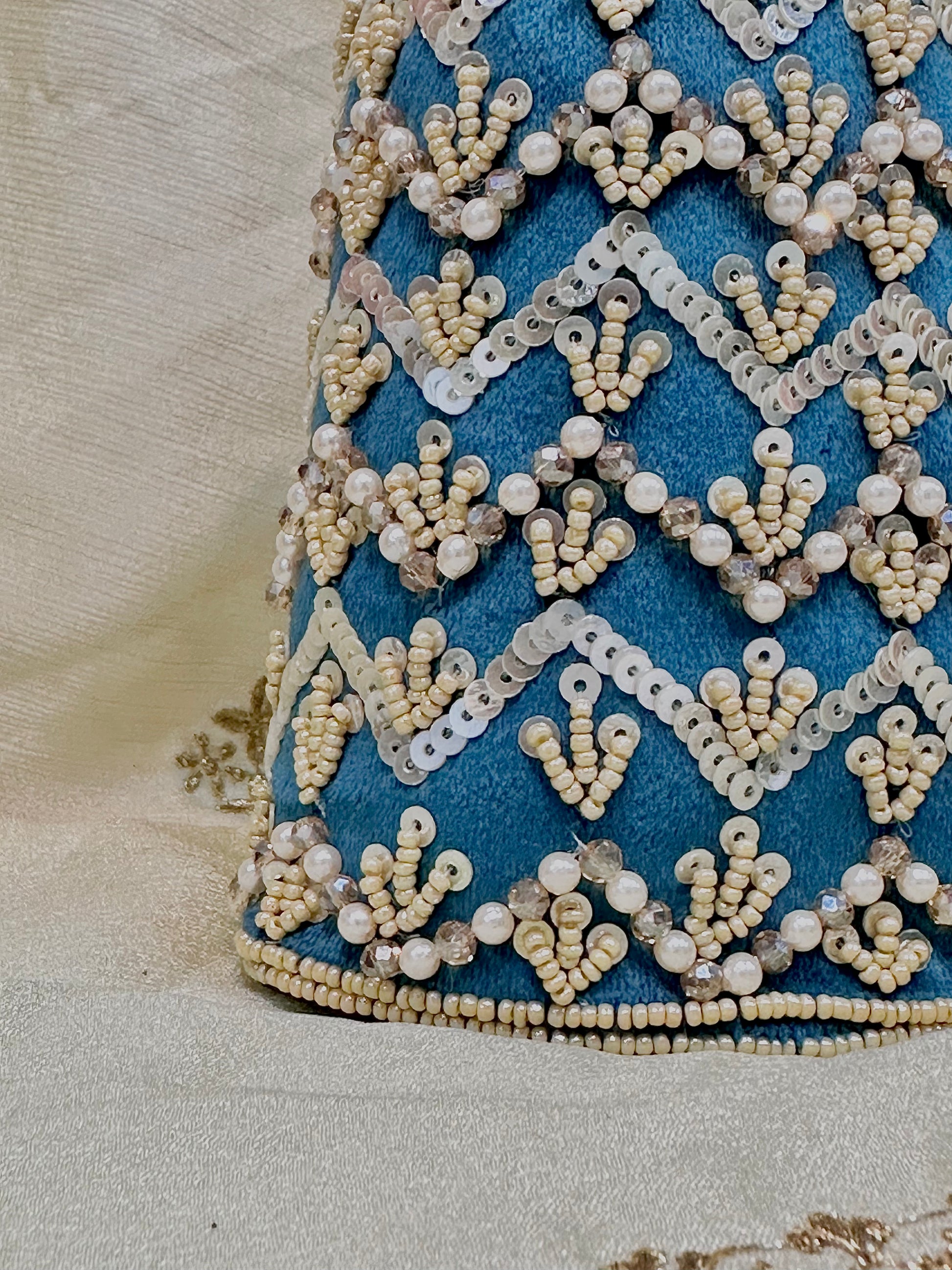 Embellishments: Cream mini beads, and shiny sequins embroidery on velvet fabric. Best part of owning a potli, the design is 360.